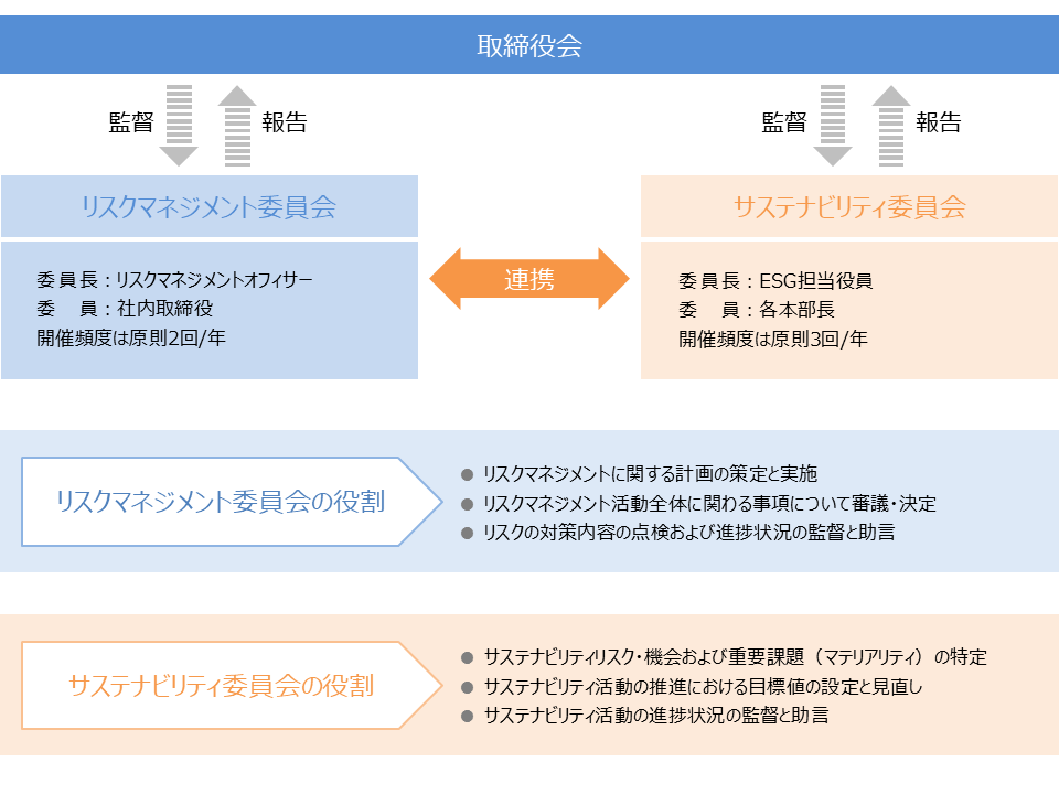 当社は、会社全体におけるリスクについて審議・決定するリスクマネジメント委員会に加えて、サステナビリティ活動を推進するための専門委員会である『サステナビリティ委員会』を設置しています。この委員会は原則として年に3回開催され、社長が委員長を務め、常勤取締役が委員として構成されており、気候関連をはじめとするサステナビリティに関するリスクおよび機会について審議します。委員会で審議された内容は取締役会に報告されることで、経営陣が監督する体制としています。