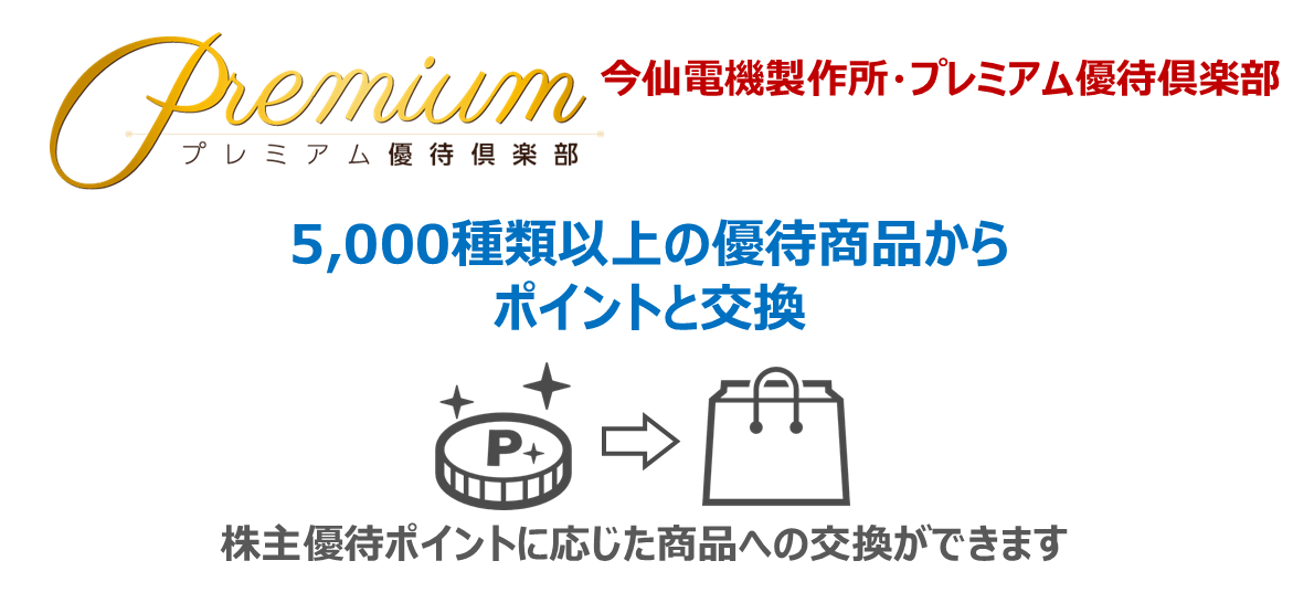 株主優待ポイントは、株主専用WEBサイト「今仙電機製作所・プレミアム優待倶楽部」において、保有する優待ポイント数に応じて、ブランド牛などのこだわりグルメ、スイーツや飲食類、銘酒、家電製品、選べる体験ギフトなど5,000種類以上の優待商品からお好みの商品をお選びいただけます。